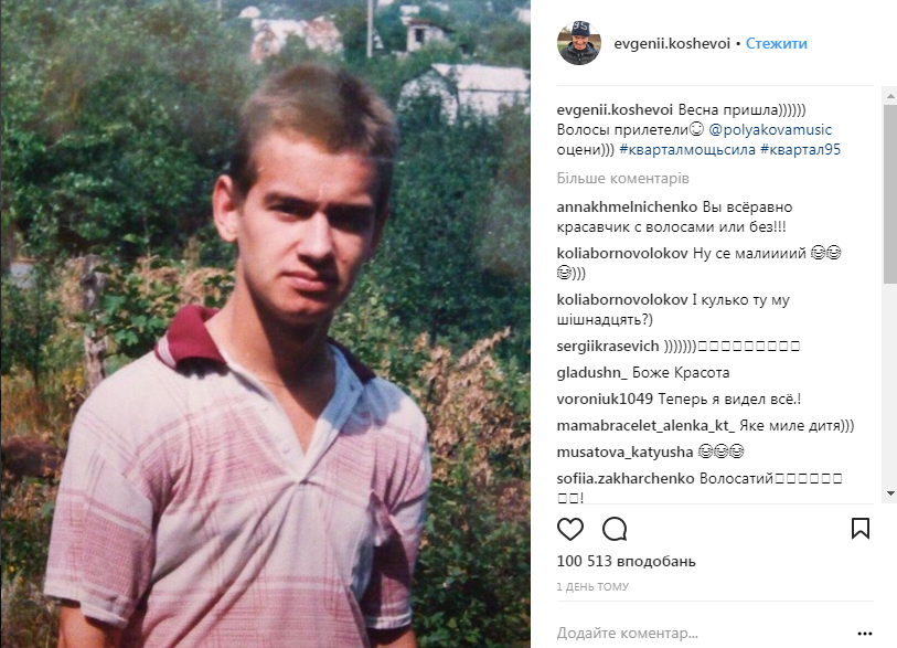 "Был лысый из Квартала, а стал – Женя кучерявый", – шутят пользователи соцсети. Также некоторые фолловеры обсуждают худощавую фигуру Кошевого, которая изменилась с тех пор и «модную» для тех времен футболку.