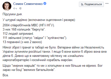 10:11 Советник Авакова Шкиряк в цветистых выражениях расписал происходящее на МихоМайдане. Найдено оружие (10 гранат), ранены полицейские. Говорит, что "задержана и приглашена для дачи пояснений 101 персона".