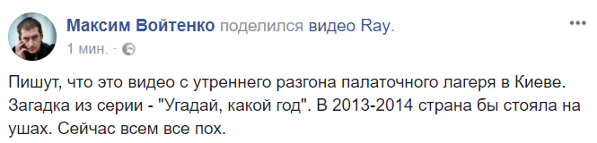 11:09 "Загадка из серии – "Угадай, какой год". В 2013-2014 страна бы стояла на ушах. Сейчас всем все пох", – пишет о разгоне МихоМайдана журналист Максим Войтенко.