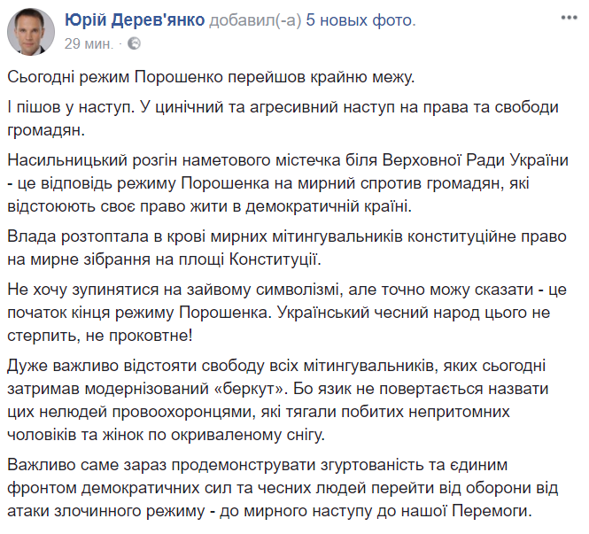 12:19 "Власть растоптала в крови мирных митингующих конституционное право на мирное собрание на площади Конституции", – написал в Facebook нардеп Юрий Деревянко.