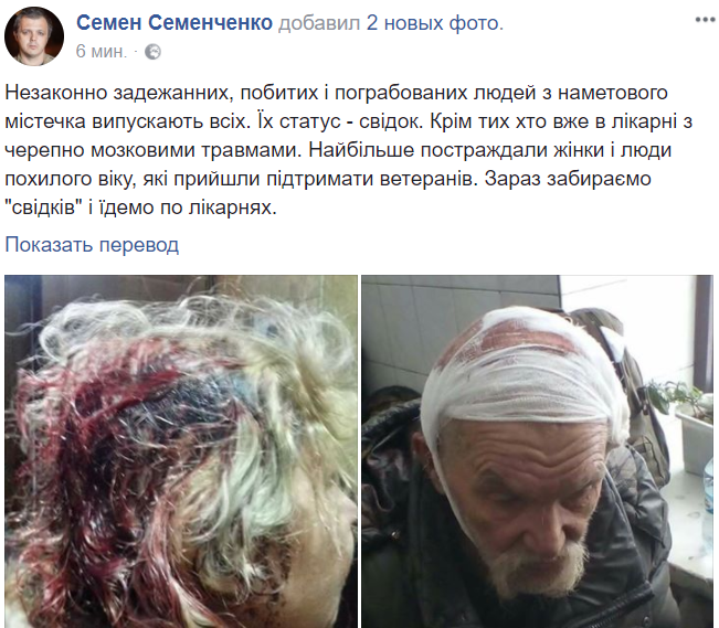13:56 Семен Семенченко показал фото избитых при штурме людей, которым "прикрутил" Аваков (как он сам написал в Twitter).