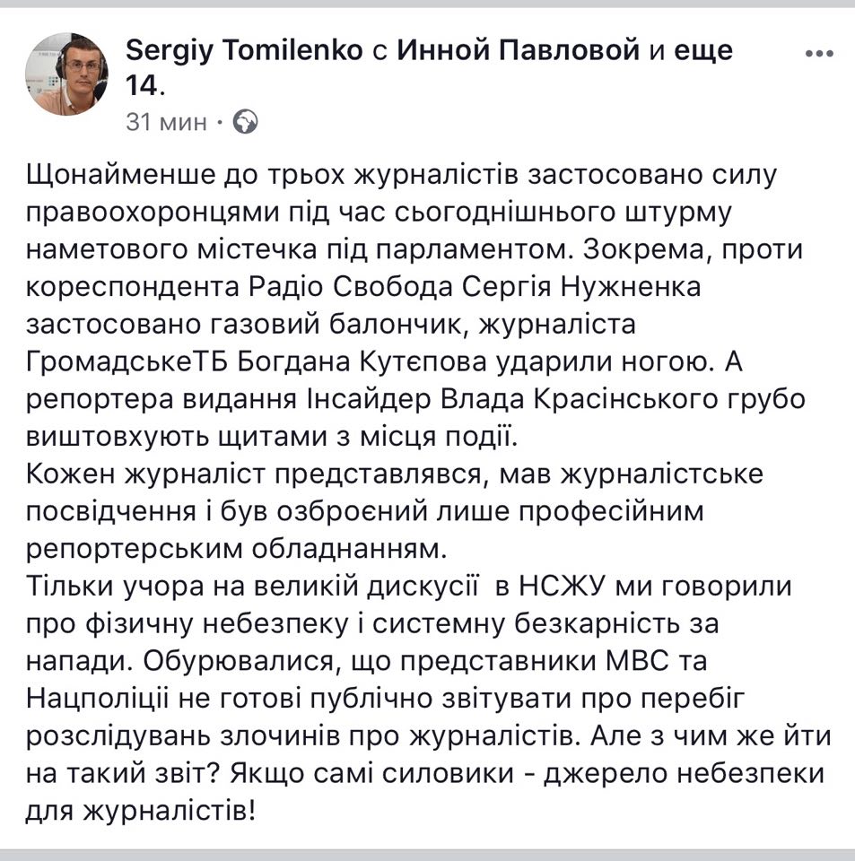 "Порошенко и Аваков решили идти по пути создания полицейского государства, а это значит, что права на мирный протест мы уже не имеем. Уничтожен лагерь активистов, которые под парламентом требовали создания независимого Антикоррупционного суда.