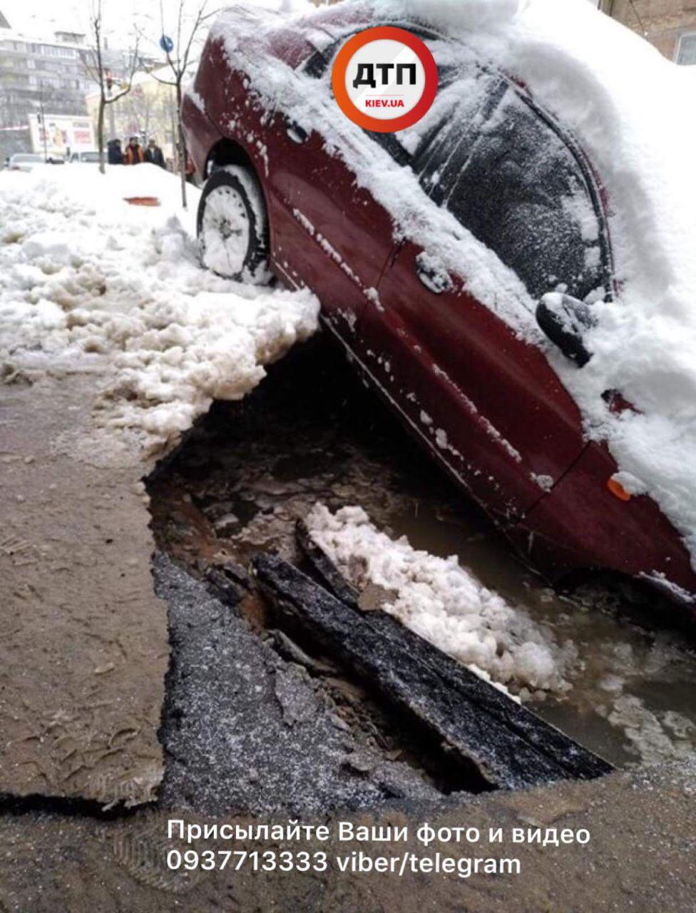В субботу, 3 марта, в Шевченковском районе Киева, где произошел масштабный прорыв трубопровода, автомобиль марки Daewoo Lanos наполовину провалился под землю.