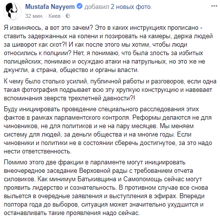 "Я извиняюсь, а вот это зачем? Это в каких инструкциях прописано - ставить задержанных на колени и позировать на камеры, держа людей за шиворот как скот?! И как после этого мы хотим, чтобы люди относились к полциии? Нет, я понимаю, что была злость за избитых полицейских; понимаю и осуждаю атаки на патрульных, но это же не джунгли, а страна, общество и органы власти.