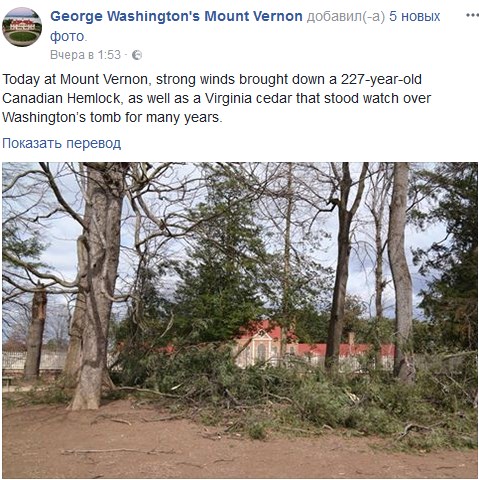 "В пятницу сильный ветер сломал 227-летнюю тсугу канадскую и вирджинский кедр, который на протяжении многих лет оберегал могилу Вашингтона", - говорится на странице поместья.