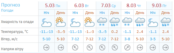 Ресурс Мeteoprog.ua обещает -1...-3 5 и 6 марта и потепление до +1...+4 с 7 марта. В среду и на выходных - сне с дождем.