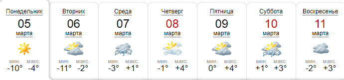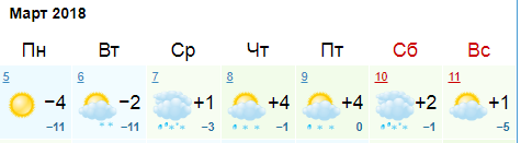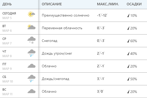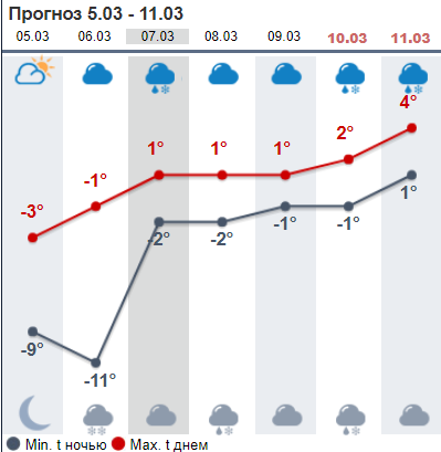 Сайт Gismeteо также прогнозирует прогнозирует небольшой минус в начале недели и потепление с 7 марта до +1...+4. Осадки ожидаются во все дни, кроме понедельника и воскресенья.