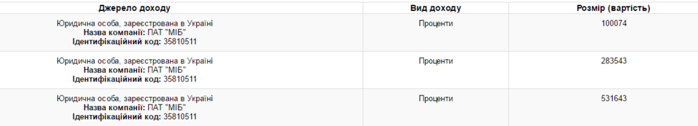 В понедельник президент задекларировал 915 260 гривен доходов от вкладов в МИБ: 531 643 гривны, 283 543 гривны и 100 074 гривны.