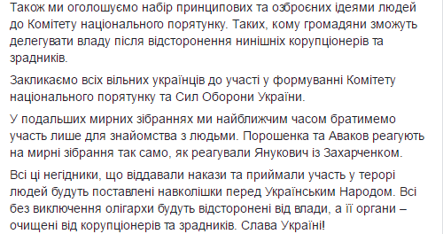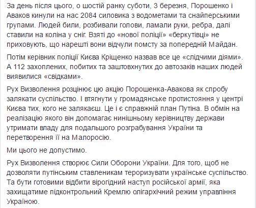 "Движение Визволення создает Силы обороны Украины. Для того чтобы не позволять путинским ставленникам терроризировать украинское общество. И быть готовыми отразить возможное наступление российской армии, которая будет защищать подконтрольный Кремлю олигархический режим управления Украины", - говорится в заявлении движения в Facebook.