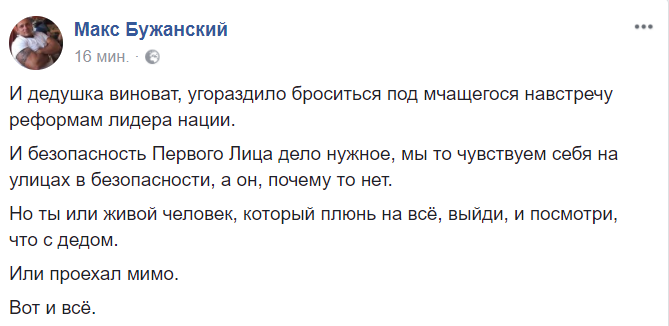 Блогер Макс Бужанский тоже удивляется, что никто из кортежа не вышел посмотреть, что с пенсионером.
