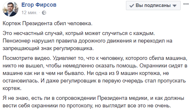 Я не знаю, есть ли в сопровождении Президента медики, и как должны вести себя охранники по протоколу, но выглядит все это не очень", - пишет экс-нардеп Егор Фирсов.