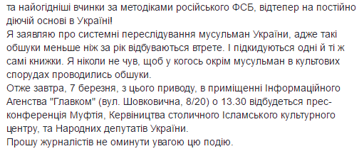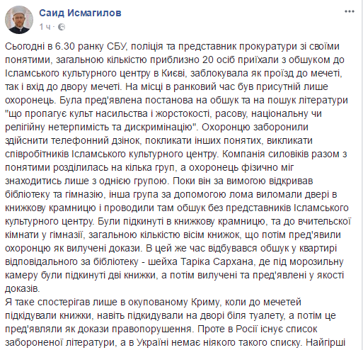 В то же время муфтий Духовного управления мусульман Украины "Умма" Саид Исмагилов заявил в Facebook, что СБУ подбросила в Исламский центр книги.