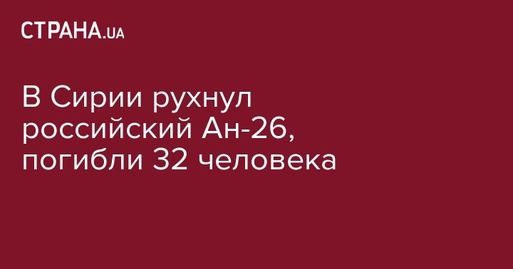 В Сирии потерпел крушение российский транспортный самолет Ан-26, сообщили в Минобороны РФ. По предварительным данным, на борту находилось 26 пассажиров и шесть членов экипажа, все они погибли.