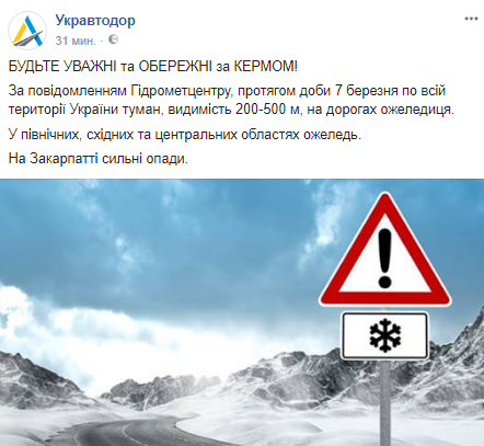 Об этом водителей предупреждает "Укравтодор" на своей странице в Facebook.