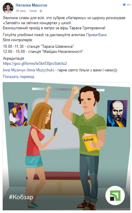 Декламировать любимые поэзии Шевченко в обмен на проезд надо будет представителям "Приватбанка" возле котролеров.