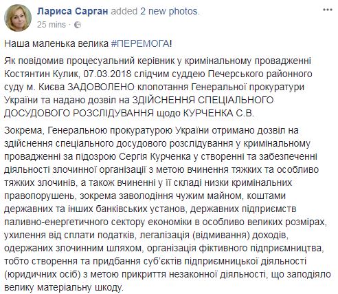 "Следственный судья Печерского районного суда Киева удовлетворил ходатайство Генеральной прокуратуры Украины и предоставил разрешение на проведение специального досудебного расследования в отношении Курченко С.В. В частности, Генпрокуратура получила разрешение на проведение специального досудебного расследования в уголовном производстве по подозрению С.Курченко в создании и обеспечении деятельности преступной организации с целью совершения тяжких и особо тяжких преступлений", - написала Сарган.