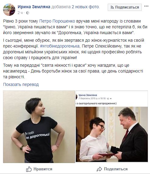 Выложив фото в футболке на своей странице в Facebook, сотрудница Института массовой информации Ирина Земляная написала: "Ровно 3 года назад Петр Порошенко вручал мне награду со словами "Ирина, Украина гордится вами" и я знаю точно, что не потерпела бы, если бы его обращение звучало как "Дорогуша, Украина гордится вами".