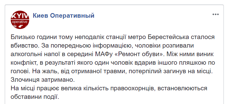 В Киеве на "Берестейской" в киоске "Ремонт обуви" убили человека бутылкой