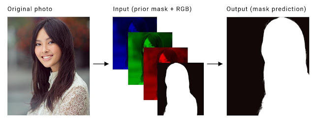 Исходный кадр (слева) разделен по трем цветным каналам и объединен с предыдущей маской (в середине). Это используется как вход в нашу нейронную сеть для прогнозирования маски для текущего кадра (справа). Фото: research.googleblog.com