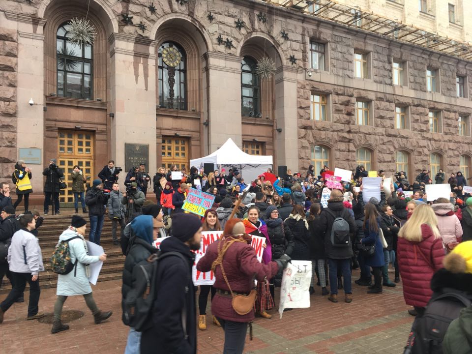 На площади у КГГА полиция забрала у активистов плакат, символизирующий борьбу украинских женщин за равные права. Копы не объяснили причины конфискации, но, вероятно, это связано с гербом Украины на плакате.