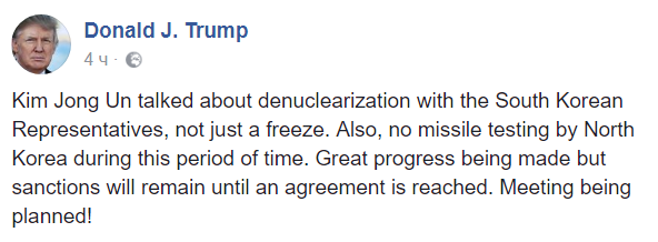 "Ким Чен Ын говорил о денуклеаризации с представителями Южной Кореи, а не только о замораживании. Кроме того, никаких испытаний ракет в течение этого периода времени не проводилось. Большой прогресс достигнут, но санкции будут сохраняться до тех пор, пока не будет достигнуто соглашение. Планируем встречу!", - заявил президент США.