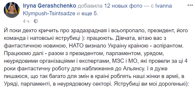 "И пока некоторые кричит о "зрадазрадная" и "всепропало", президент, его команда и натовские ястребки работают. Девушки, поздравляю вас с фантастической новостью: НАТО признало Украину страной-аспирантом", – вторит ему вице-спикер.