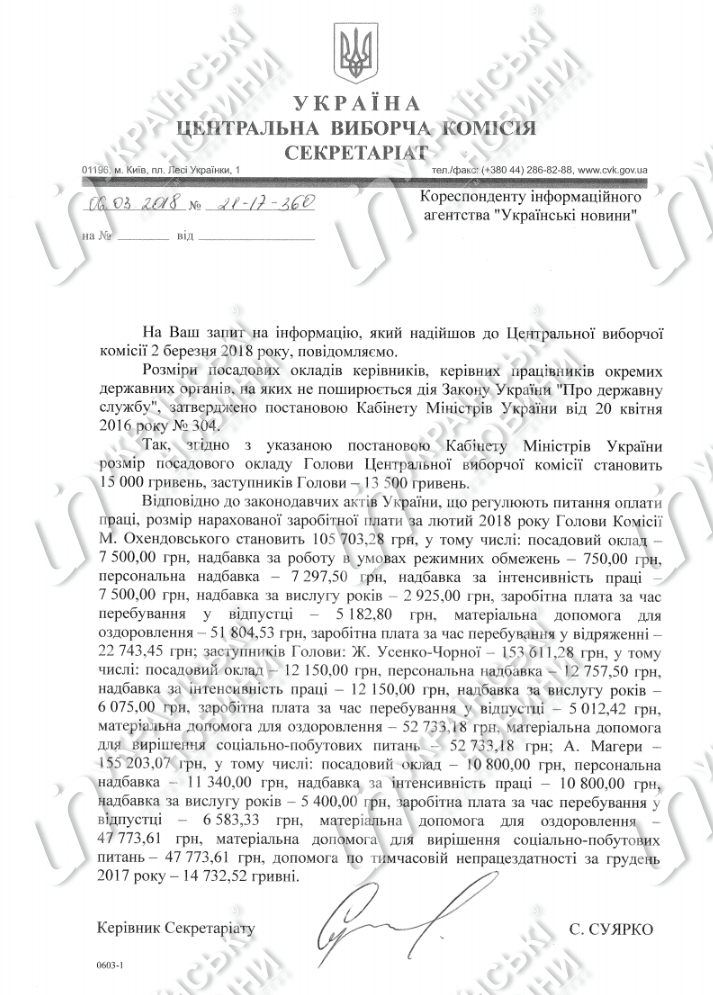"Размер начисленной заработной платы за февраль 2018 председателя ЦИК составляет 105 703,28 гривен", - сказано в официальном ответе на запрос.