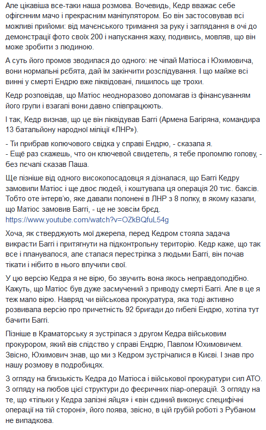 Еще позже от одного высокопоставленного лица я узнала, что Багги Кедру заказали Матиос и еще два человека, и стоила эта операция 20 тыс. долларов. То есть то интервью, которое давали пленные в ЛНР из 8-го полка, в котором говорили, что Матиос заказал Багги, – это не совсем бред.
