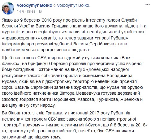 Бойко напомнил, что глава СБУ на брифинге 9 марта рассказал о задержании на выезде из "ДНР" Владимира Рубана.
