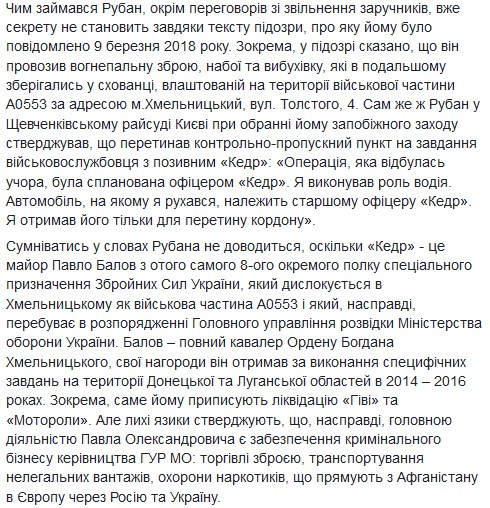 "Чем занимался Рубан, кроме переговоров по освобождению заложников, уже секрета не представляет благодаря тексту подозрения, которое ему было предъявлено 9 марта 2018 года. В частности, сказано, что он провозил огнестрельное оружие, патроны и взрывчатку, которые в дальнейшем хранились в тайнике, устроенном на территории военной части А0553 по адресу г. Хмельницкий, ул. Толстого, 4. Сам же Рубан в Шевченковском райсуде Киева при избрании ему меры пресечения утверждал, что пересекал контрольно-пропускной пункт по заданию военнослужащего с позывным "Кедр": "Операция, которая состоялась вчера, была спланирована офицером Кедр. Я выполнял роль водителя. Автомобиль, на котором я передвигался, принадлежит старшему офицеру Кедр. Я получил его только для пересечения границы".