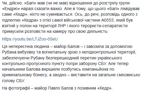 Наверное, самой известной операцией, которую приписывают Кедру, стала ликвидация 2 октября 2016 года на территории "ЛНР" гражданина России Армена Багиряна по прозвищу Багги, чей труп был нужен руководству ГУР МО для того, чтобы на него "повесить" расстрел под Счастьем в сентябре 2015 года сводной мобильной группы во главе с внештатным сотрудником СБУ Андреем Галущенко (Эндрю). Эта группа фиксировала факты нелегального пересечения грузов через линию разграничения и сильно донимала военных разведчиков, для которых "контрабанда" была – и, наверное, есть и сейчас – главным источником дохода.