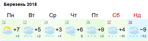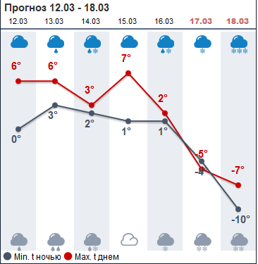 Ресурс Мeteoprog.ua обещает дождь 13 марта, а 14 марта - дождь со снегом.Осадки в виде мокрого снега возобновятся 16 марта и 17-18 марта перейдут в снег. Дневная температура +2...+7, ночью 0...+3. На выходных похолодает до -5...-7 днем и -4...-10 ночью.
