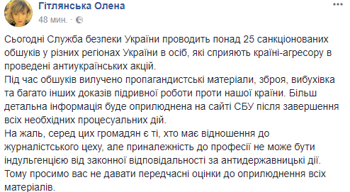 "Во время обысков изъяты пропагандистские материалы, оружие, взрывчатка и многие другие доказательств подрывной работы против нашей страны. Более подробная информация будет обнародована на сайте СБУ после завершения всех необходимых процессуальных действий. К сожалению, среди этих граждан есть те, кто имеет отношение к журналистскому цеху, но принадлежность к профессии не может быть индульгенцией от законной ответственности за антигосударственные действия. Поэтому просим вас не давать преждевременные оценки до обнародования всех материалов", - написала Гитлянская.