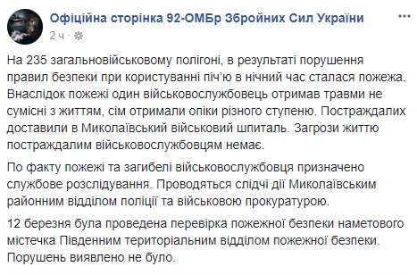 "Во время пожара один военнослужащий получил травмы, не совместимые с жизнью, семь получили ожоги различной степени. Пострадавших доставили в Николаевский военный госпиталь. Угрозы жизни пострадавшим военнослужащим нет", - говорится в сообщении.