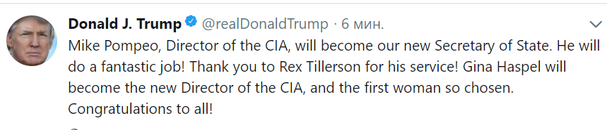 Его место займет директор ЦРУ Майк Помпео, пишет Трамп. А место самого Помпео займет первая женщина-руководитель в истории ведомства - Джина Хэспел.