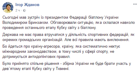 "Было принято совместное решение - сборная Украины не будет принимать участие в девятом этапе Кубка мира в Тюмени", - написал Жданов.