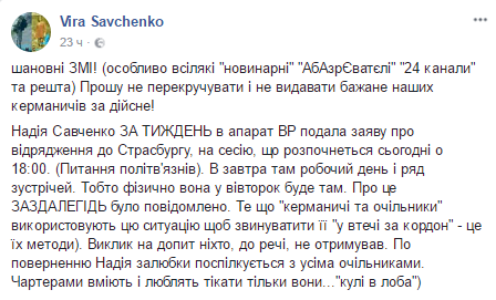 Ранее на странице в Facebook сестра Савченко Вера Савченко написала, что нардеп за неделю подала заявление в аппарат ВР о командировке в Страсбург. "На сессию, которая начнется сегодня в 18:00. (Вопрос политзаключенных). Завтра там рабочий день и ряд встреч. То есть физически она во вторник будет там", - сказала Вера Савченко.