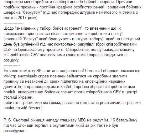 "Информация, которая распространяется Аваковым не соответствует действительности. Никаких "следственных действий" перед нападением на лагерь не было. О нападении на активистов, (которые более 4 месяцев требовали создания антикоррупционного суда под ВР) стало известно накануне. Информация об этом была обнародована Рухом Визволенняя вместе с призывом киевлянам прийти и помочь защитить лагерь. Когда утром была замечена колонна КрАЗ и автобусов, которая подъезжает к лагерю, ветераны войны обратились ко мне с просьбой перенести свои личные вещи в отель. Информация о том, что полиция меня "не проверила", потому что я являюсь народным депутатом также не соответствует действительности. Хочу предоставить для СМИ вторую часть записи с камер наружного наблюдения, которую министр МВД почему-то стыдливо умалчивает. На ней отчетливо видно, что я передаю сумки двум гражданам и возвращаюсь в лагерь. Далее их никто и не пытается смотреть. Сразу после избиения людей и грабежа в палаточном городке незаконно задержаны ветераны (которые вечером были отпущены в статусе "свидетель") также попросили меня принять на хранение их боевые шевроны. Причины подобных просьб - постоянная кража личных вещей и срывание боевых шевронов "Беркутом" (во время предыдущих штурмов палаточного городка с октября 2017 года)", - написал Семенченко.