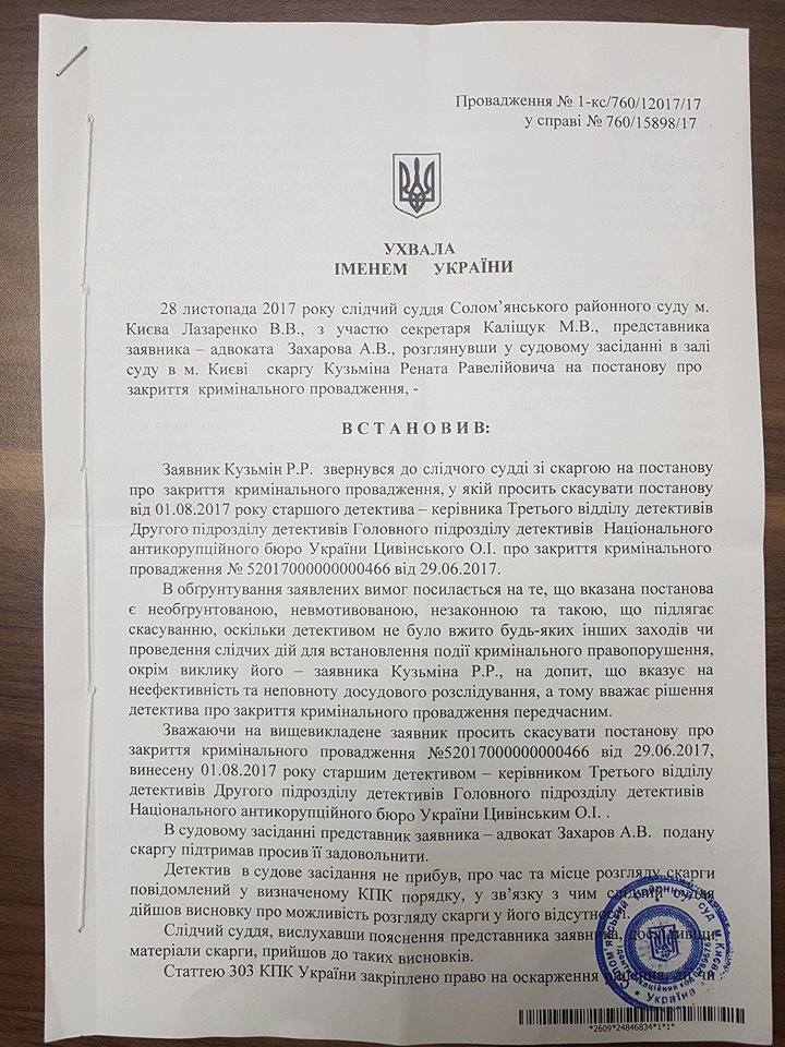 Но вернемся к Сытнику. Выполняя определение суда, он все-таки зарегистрировал дело против Турчинова, но вот расследовать его не стал, а тихонько и, как ему казалось, незаметно для всех прекратил. Пришлось помочь и ему. Публикую определение Соломенского суда г. Киева об отмене незаконного постановления НАБУ о прекращении уголовного производства N 52017000000000466 о хищении в особо крупных размерах (ч. 5 ст. 191 УК Украины). И хоть суд несколько месяцев и "прятал" это определение, но все же вынужден был выдать мне его копию", – пишет Ренат Кузьмин, прилагая сканы документа.