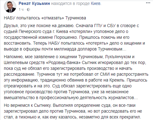 Экс-заместитель генерального прокурора Ренат Кузьмин заявил, что НАБУ попыталось закрыть дело о хищении и выводе в офшоры почти миллиарда долларов секретарем СНБО Александром Турчиновым. Однако суд обязал Антикоррупционное бюро возобновить расследование.
