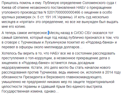 "А теперь самое интересное. Месяц назад в СИЗО СБУ оказался тот самый Шепелев, который еще год назад публично признался в том, что в сговоре с Турчиновым и Лукьянчуком похитил из Родовид-банка и перевел в офшоры около миллиарда долларов… Хотелось бы верить в то, что НАБУ все же в состоянии расследовать преступления о топ-коррупции, а незаконное прекращение дела о хищениях в Родовид-банке останется лишь досадным недоразумением. Кстати, это дело могло бы стать началом нового расследования против Турчинова, ведь именно он, исполняя в 2014 году обязанности Президента и Верховного главнокомандующего, умышленно не предпринял никаких мер по защите территориальной целостности Украины и сдал Крым без единого выстрела. Государственная измена, однако…" – написал в соцсети бывший заместитель генерального прокурора.
