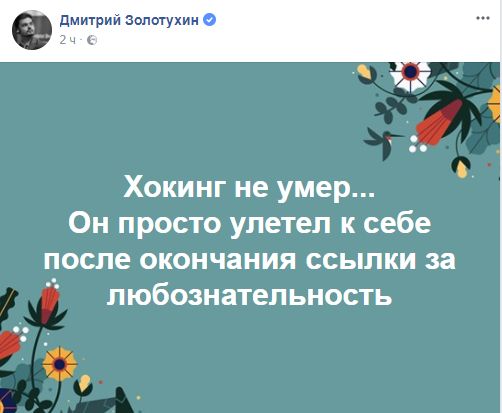 Замминистра информационной политики Дмитрий Золотухин: "Хокинг не умер... Он просто улетел к себе после окончания ссылки за любознательность".