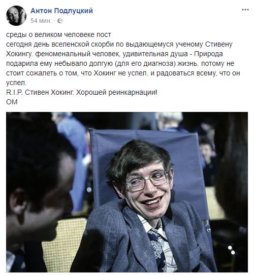 О смерти выдающегося ученого высказались и украинские блогеры. Так, журналист Антон Подлуцкий написал: "Сегодня день вселенской скорби по выдающемуся ученому Стивену Хокингу. Феноменальный человек, удивительная душа – Природа подарила ему небывало долгую (для его диагноза) жизнь. Потому не стоит сожалеть о том, что Хокинг не успел, и радоваться всему, что он успел.