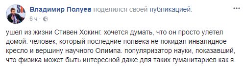 Телеведущий Владимир Полуев отметил роль Хокинга в популяризации науки: "Ушел из жизни Стивен Хокинг. Хочется думать, что он просто улетел домой. Человек, который последние полвека не покидал инвалидное кресло и вершину научного Олимпа. Популяризатор науки, показавший, что физика может быть интересной даже для таких гуманитариев, как я".