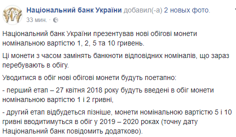 Однако вводить в обращение новые обиходные монеты будут поэтапно: первый этап - 27 апреля 2018 года будут введены в обращение монеты номинальной стоимостью 1 и 2 гривны. Второй этап состоится позже, монеты номинальной стоимостью 5 и 10 гривны будут вводиться в обращение в 2019 - 2020 годах. Точную дату Национальный банк сообщит дополнительно.