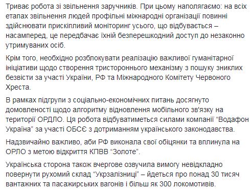 Киев также настаивает на том, чтобы РФ выполнила свои обещания и повлияла на поддерживаемых Россией боевиков с целью открытия контрольно-пропускного пункта Золотое.