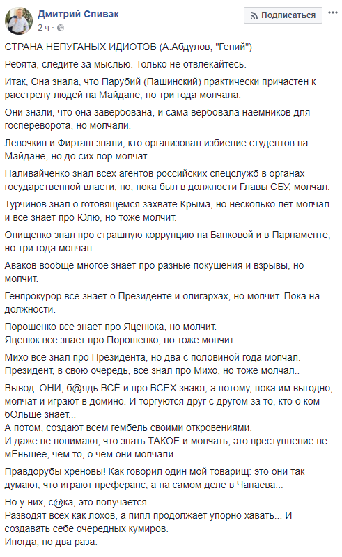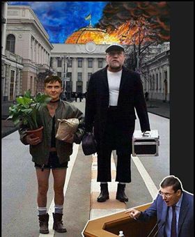 "Чтобы скрасить очередной конфуз по ловле воздуха, Луценко бросил информационную бомбу насчет Савченко. Юрию Витальевичу точно известно, что Надежда Савченко имела намерения и вербовала людей для того, чтобы 1. взорвать две ложи в ВР. 2. из минометов расстрелять купол Рады. 3. из автоматов добивать оставшихся в живых. Ее, как будто прямо сейчас, допрашивают в СБУ. Теперь понятно для кого Рубан минометы с той стороны в старой мебели перевозил.
