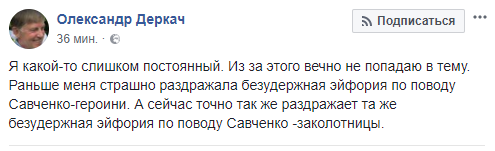 "Я какой-то слишком постоянный. Из за этого вечно не попадаю в тему. Раньше меня страшно раздражала безудержная эйфория по поводу Савченко-героини. А сейчас точно так же раздражает та же безудержная эйфория по поводу Савченко -заколотницы", написал Александр Деркач.