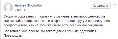 "Скоро мусора занесут половину украинцев в антипорошенковские списки сайта "Миротворец" - и натравят на них другую половину. Под предлогом того, что на этом же сайте есть российские оккупанты. Все гениальное просто. До такого даже Путин не додумался. Превзошли", - написал Андрей Шокотко.