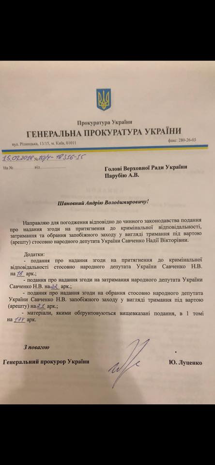 Генпрокурор заявил, что сегодня будет подано представление на снятие неприкосновенности и задержание Савченко.